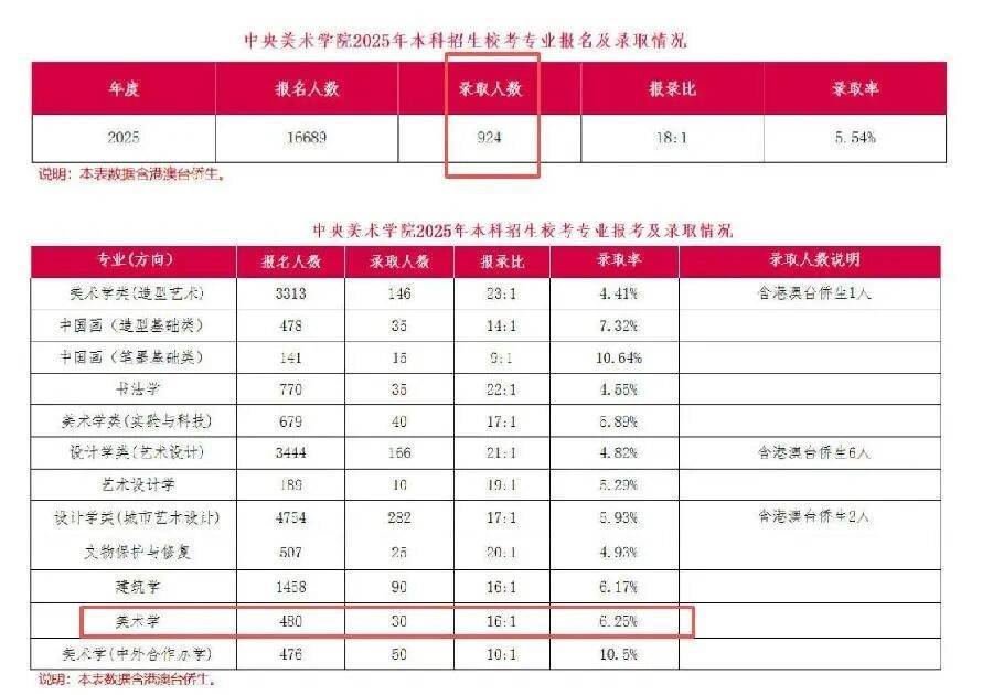 中央美术学院2025年本科招生校考专业报名及录取情况。