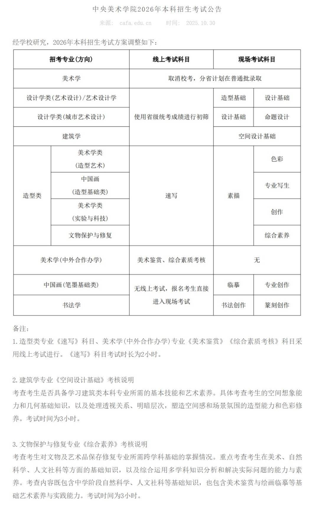 中央美术学院2026年本科招生考试公告。