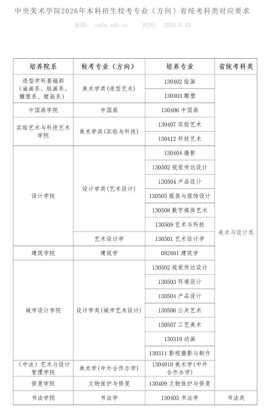 中央美术学院2026年本科招生校考专业(方向)省统考科类对应要求。